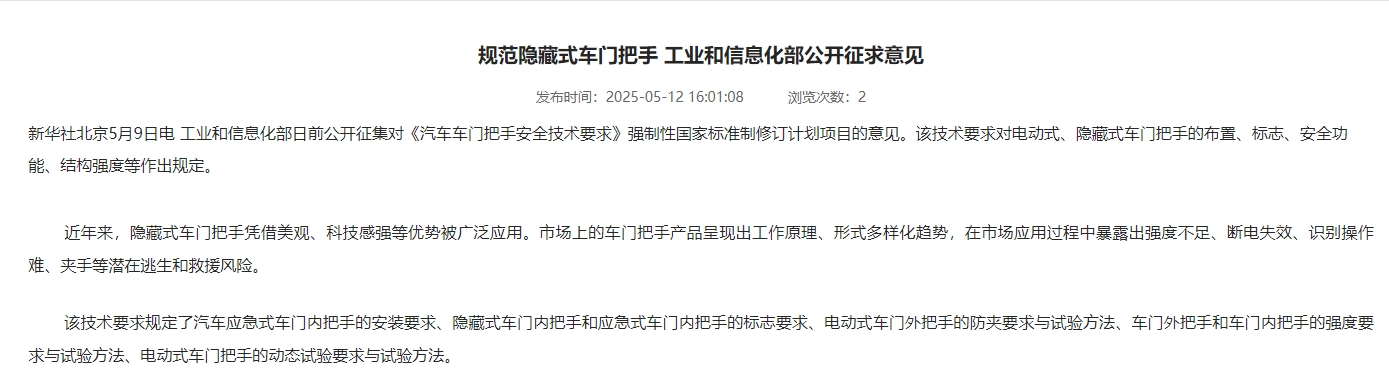 新华社北京5月9日电 工业和信息化部日前公开征集对《汽车车门把手安全技术要求》强制性国家标准制修订计划项目的意见。该技术要求