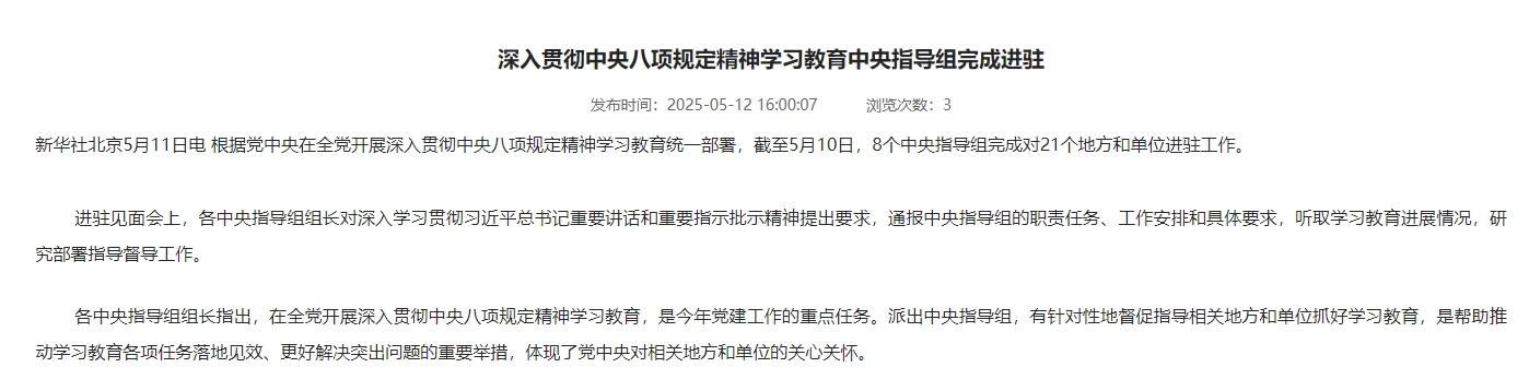 新华社北京5月11日电 根据党中央在全党开展深入贯彻中央八项规定精神学习教育统一部署,截至5月10日,8个中央指导组完成对21个地